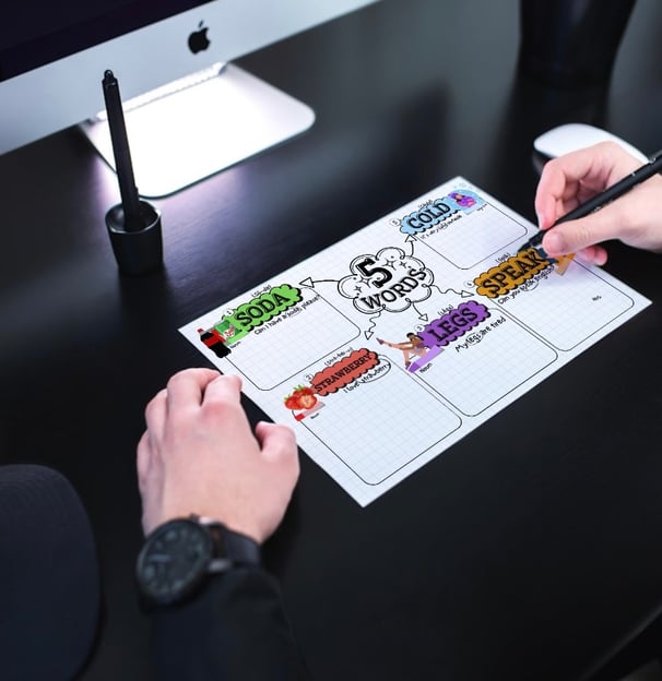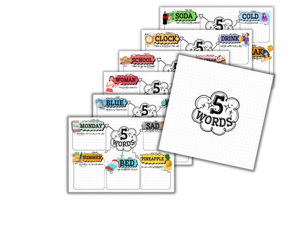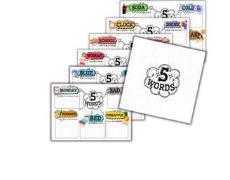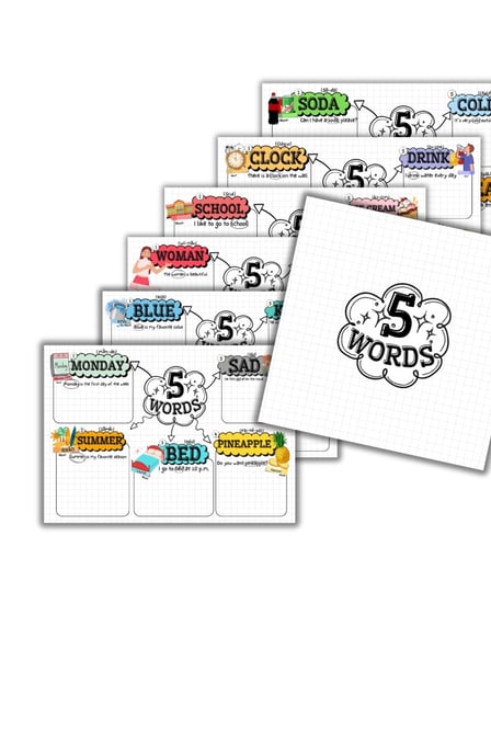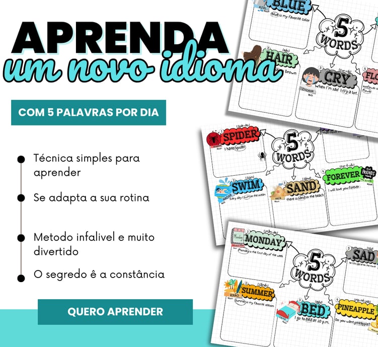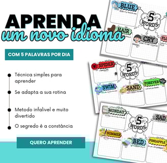 Ao adquirir o 5WORDS, você terá acesso a 4 PDFS e um material completo com 36 cards prontos para impressão ou utilização online para aprender um novo idioma de forma prática e sem pressão.